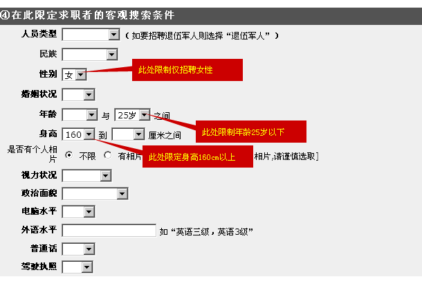 當前位置:信息>> 怎樣設(shè)定多個條件(如同時限制性別、年齡、身高)進行人才搜索