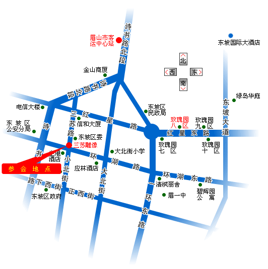 乘車路線:在眉山市客運中心站乘3路、14路、7路車直達